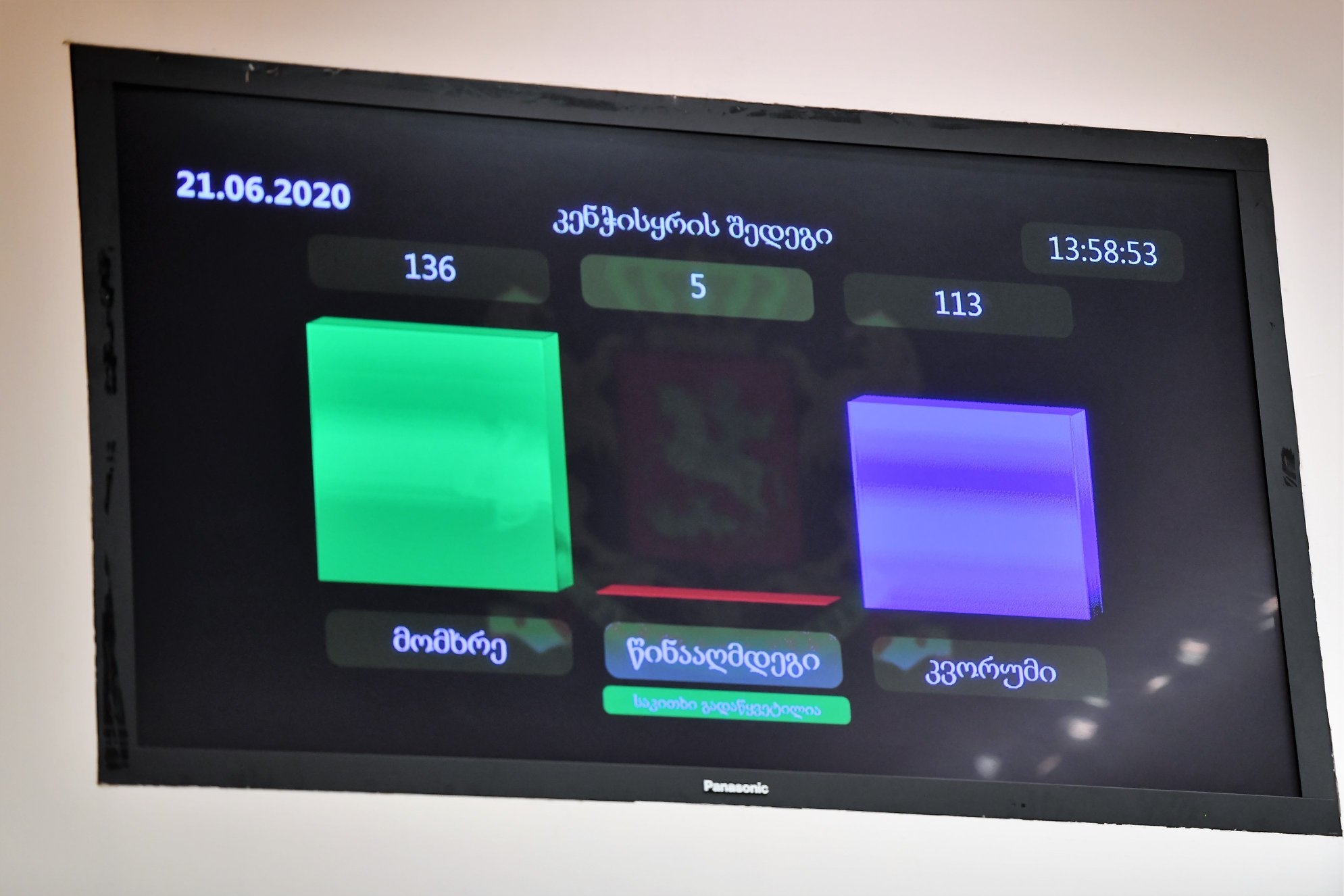 საქართველოს პარლამენტმა საკონსტიტუციო ცვლილებებს პირველი მოსმენით მხარი დაუჭირა - 136 ხმით 5-ის წინააღმდეგ. რეგისტრაცია 142-მა დეპუტატმა გაიარა.
