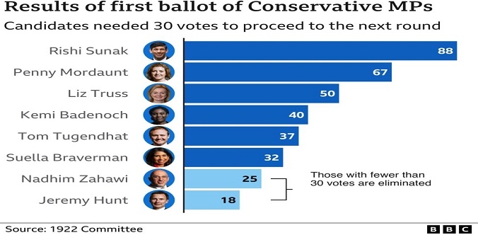 He got 88 votes, with Trade Minister Penny Mordaunt in second place on 67 and Foreign Secretary Liz Truss third on 50.
