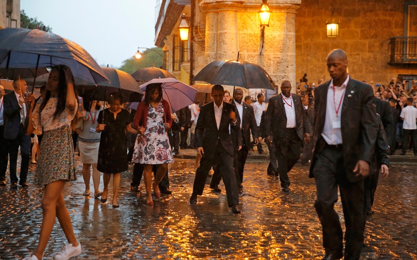 ბარაქ ობამა მეუღლესთან, ქვეყნის პირველ ლედისთან, მიშელ ობამასთან და შვილებთან - საშასა და მალიასთან ერთად "საჰაერო ძალა ერთი"-დან ღიმილით და ქოლგით გამოჩნდა, მსუბუქი ჟინჟლვის პირობებში ჩამოვიდა ტრაპიდან და კუბის საგარეო საქმეთა მინისტრს, ბრუნო როდრიგესსა და სხვა ოფიციალურ პირებს მიესალმა.