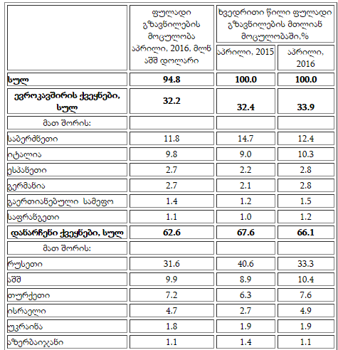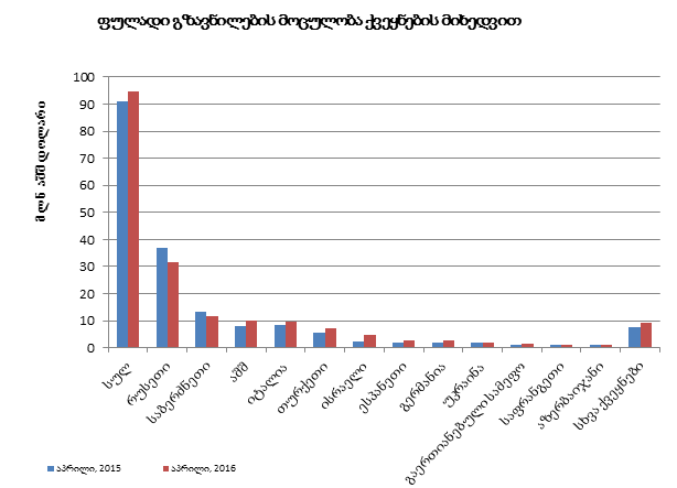 2016 წლის აპრილში საქართველოდან საზღვარგარეთ 16.3 მლნ აშშ დოლარი (37.0 მლნ ლარი) გადაიგზავნა, ნაცვლად 14.5 მლნ აშშ დოლარისა (32.8 მლნ ლარისა) გასული წლის აპრილში.