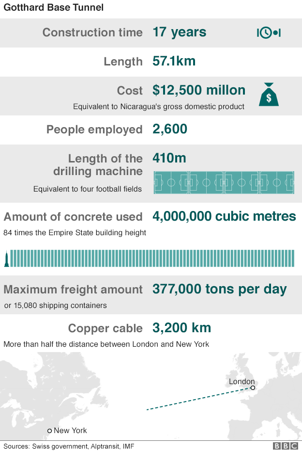 57 კილომეტრის სიგრძის გოტჰარდის გვირაბი, რომელიც მაღალი სიჩქარის მატარებლებისთვის იქნება განკუთვნილი და შვეიცარიის ალპების ქვეშ გადის, ჩრდილოეთ და სამხრეთ ევროპას შორის დამაკავშირებელ მარშრუტს წარმოადგენს.
