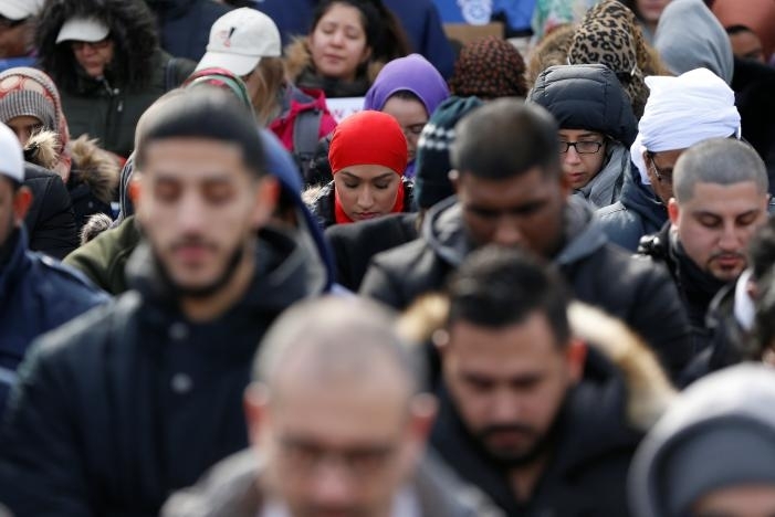 (დემონსტრანტები ლოცულობენ ნიუ იორკის ბრუკლინის რაიონში, სადაც იემენის საზოგადოების წარმომადგენლები შეერთებული შტატების პრეზიდენტის, დონალდ ტრამპის მოგზაურობისაკრძალვას აპროტესტებდნენ. 2 თებერვალი, 2017 წელი - Reuters-ის ფოტო).