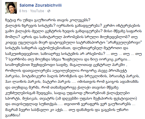 "ნეტავ რა უნდა გაუზიაროს თავის კოლეგებს? ქალაქის ნგრევის სისტემა? იერსახის განადგურება? კერძო ინტერესების გამო ქალაქის ძველი ცენტრის ხედის განდაგურება? მისი მწვანე საფარის მოშლა?"- ასე ეხმაურება სალომე ზურაბიშვილი თბილისის მერის დავით ნარმანიას ამერიკის შეერთებულ შტატებში ვიზიტს, სადაც ნარმანია ნიუ იორკში მერების კონფერენციაზე დასასწრებად გაემგზავრა.