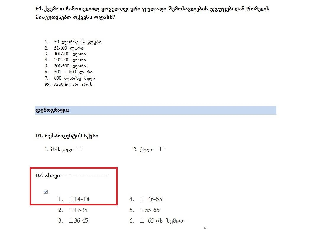 „შესაძლოა, არაფერი უცნაური და კანონსაწინააღმდეგო აღნიშნული სახის გამოკითხვაში არ იყოს, რომ არა ამ ვრცელი, ხშირ შემთხვევაში პოლიტიკური ხასიათის შეკითხვებზე პოტენციურად პასუხის გამცემთა ასაკობრივი ჯგუფები, რომელიც კითხვარების ბოლოსაა მითითებული, რომლის მიხედვითაც რესპონდენტთა ასაკი 14 წლიდან იწყება. (14-18 წლამდე ასაკის). მოგეხსენებათ, რომ ამ ასაკობრივი ჯგუფისთვის პოლიტიკური ხასიათის შეკითხვების დასმა და ზოგადად, მათი პოლიტიზება მიზანშეწონილი არ არის“, - აცხადებს გურამ ადამაშვილი და ვაშაძის ორგანიზაციის მიერ შედგენილი პოლიტიკური შეკითხვებიდან რამდენიმეზე აჩერებს ყურადღებას.
