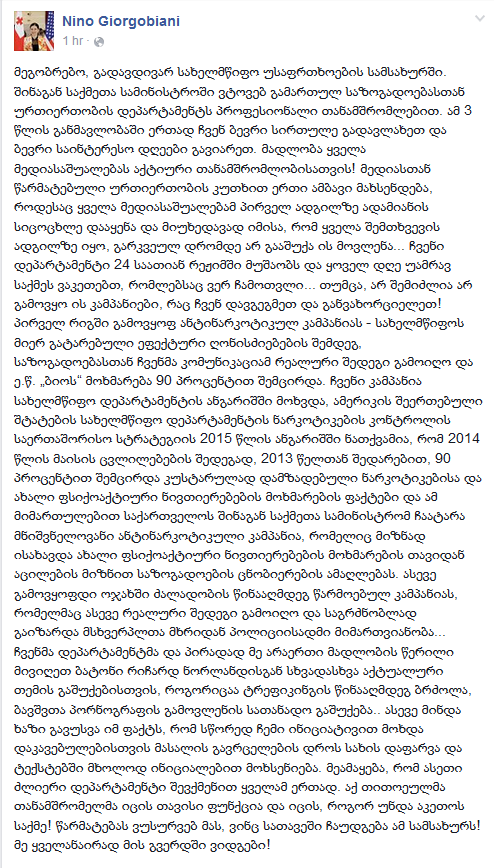 „მეგობრებო, გადავდივარ სახელმწიფო უსაფრთხოების სამსახურში. შინაგან საქმეთა სამინისტროში ვტოვებ გამართულ საზოგადოებასთან ურთიერთობის დეპარტამენტს პროფესიონალი თანამშრომლებით. ამ 3 წლის განმავლობაში ერთად ჩვენ ბევრი სირთულე გადავლახეთ და ბევრი საინტერესო დღეები გავიარეთ. მადლობა ყველა მედიასაშუალებას აქტიური თანამშრომლობისათვის! მედიასთან წარმატებული ურთიერთობის კუთხით ერთი ამბავი მახსენდება, როდესაც ყველა მედიასაშუალებამ პირველ ადგილზე ადამიანის სიცოცხლე დააყენა და მიუხედავად იმისა, რომ ყველა შემთხვევის ადგილზე იყო, გარკვეულ დრომდე არ გააშუქა ის მოვლენა… ჩვენი დეპარტამენტი 24 საათიან რეჟიმში მუშაობს და ყოველ დღე უამრავ საქმეს ვაკეთებთ, რომლებსაც ვერ ჩამოთვლი…