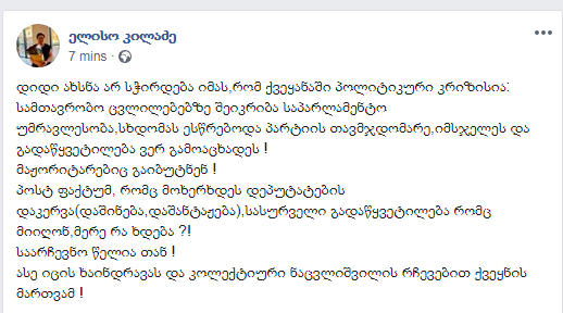 გაზეთ „ქრონიკა+“-ის მთავარი რედაქტორი ელისო კილაძე მიიჩნევს, რომ „ქვეყანაში პოლიტიკური კრიზისია, რადგან „სამთავრობო ცვლილებებზე შეიკრიბა საპარლამენტო უმრავლესობა... იმსჯელეს და გადაწყვეტილება ვერ გამოაცხადეს“.