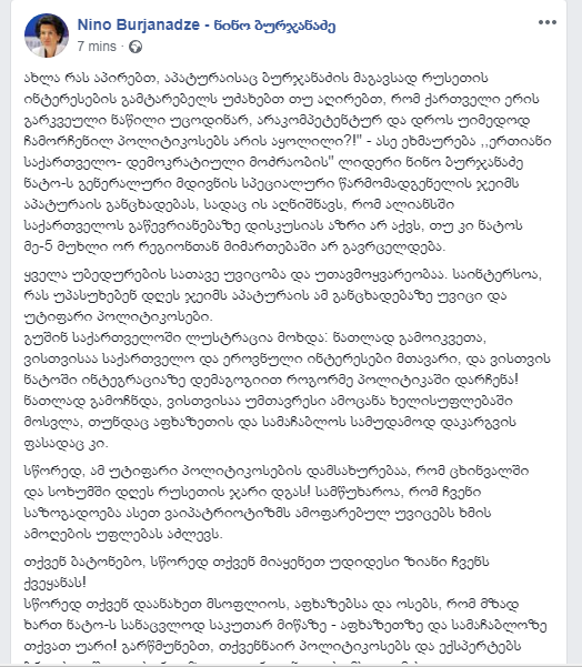 „ახლა რას აპირებთ, აპატურაისაც ბურჯანაძის მსგავსად რუსეთის ინტერესების გამტარებელს უძახებთ თუ აღიარებთ, რომ ქართველი ერის გარკვეული ნაწილი უცოდინარ, არაკომპეტენტურ და დროს უიმედოდ ჩამორჩენილ პოლიტიკოსებს არის აყოლილი?!“ - ასე ეხმაურება „ერთიანი საქართველო - დემოკრატიული მოძრაობის“ ლიდერი ნინო ბურჯანაძე ნატო-ს გენერალური მდივნის სპეციალური წარმომადგენელის, ჯეიმს აპატურაის განცხადებას, სადაც ის აღნიშნავს, რომ ალიანსში საქართველოს გაწევრიანებაზე დისკუსიას აზრი არ აქვს, თუ კი ნატოს მე-5 მუხლი ორ რეგიონთან მიმართებაში არ გავრცელდება.
