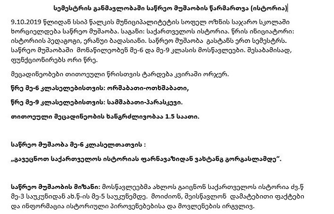 წალკის მუნიციპალიტეტის სოფელ ოზნის საჯარო სკოლაში მიმდინარეობს საწრეო მუშაობა ისტორიაში, დაწყებითსა და საშუალო საფეხურის მოსწავლეებთან. წრის ხელმძღვანელია ისტორიის პედაგოგი, ერანუი ბადასიანი.