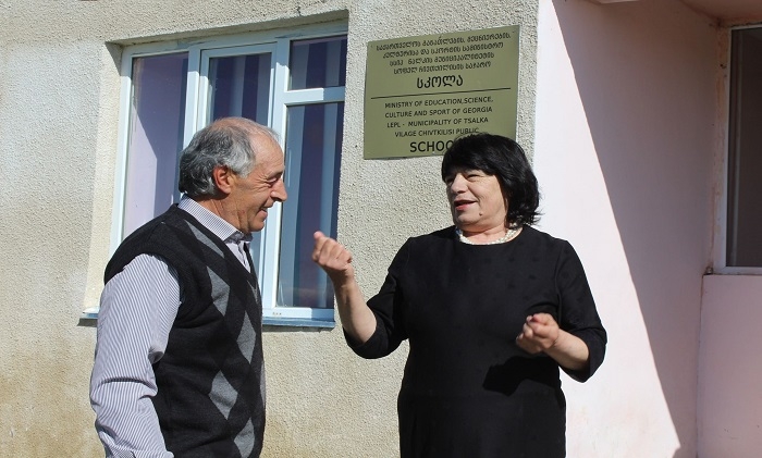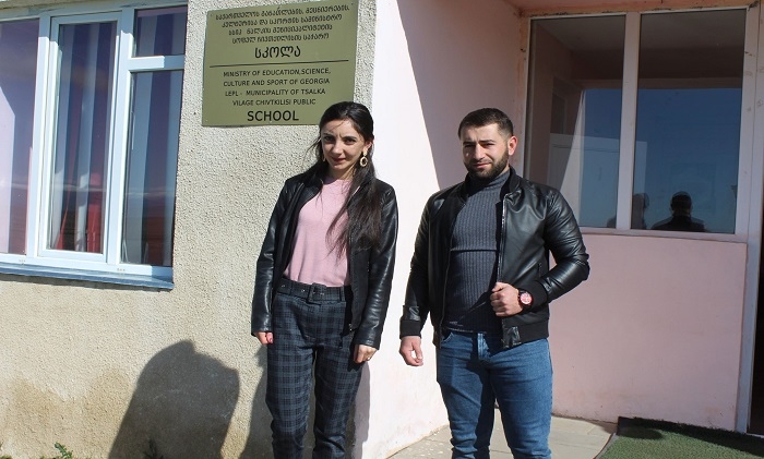 (GUARDIAN.GE-ის ფოტოზე: ჩივთქილისის საჯარო სკოლის დირექტორი ვართუი სარკსიანი რუსული ენისა და ლიტერატურის მასწავლებელ სურიკ ბაბოიანთან ერთად)