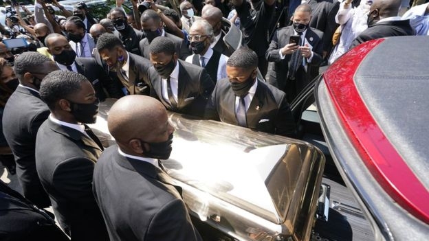 Mr Floyd's coffin was taken to a cemetery in Pearland, south of Houston for a private burial ceremony. For the last mile of the procession it was conveyed in a horse-drawn carriage.