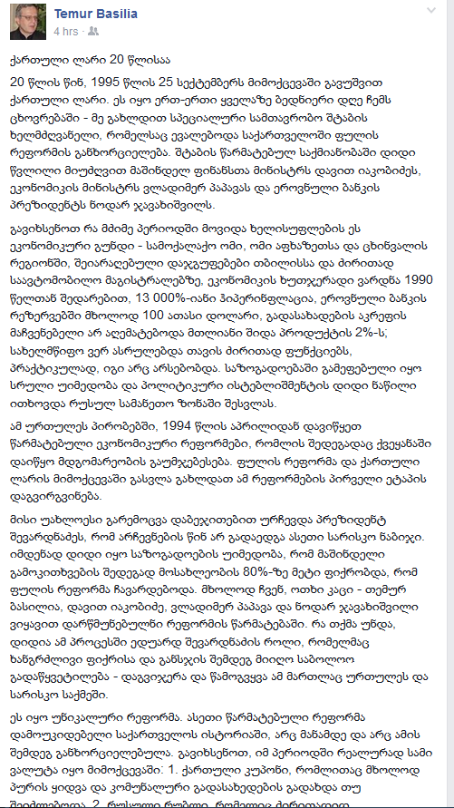 ბევრი საინტერესო ფაქტის მოყოლა შეიძლება ფულის რეფორმასა და ლარის შემოღებასთან დაკავშირებით, მაგრამ სამწუხაროდ, ფეისბუკის ფორმატი ამის საშუალებას არ იძლევა. იმედია, მექნება საშუალება, რომ უფრო დეტალურად მოგიყვეთ ამ საკითხთან დაკავშირებული საინტერესო ისტორიები“, – წერს თემურ ბასილია "ფეისბუქის" საკუთარ გვერდზე.