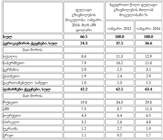 2016 წლის იანვარში საქართველოდან საზღვარგარეთ 11.9 მლნ აშშ დოლარი (29.0 მლნ ლარი) გადაიგზავნა, ნაცვლად 12.5 მლნ აშშ დოლარისა (24.3 მლნ ლარისა) გასული წლის იანვარში.