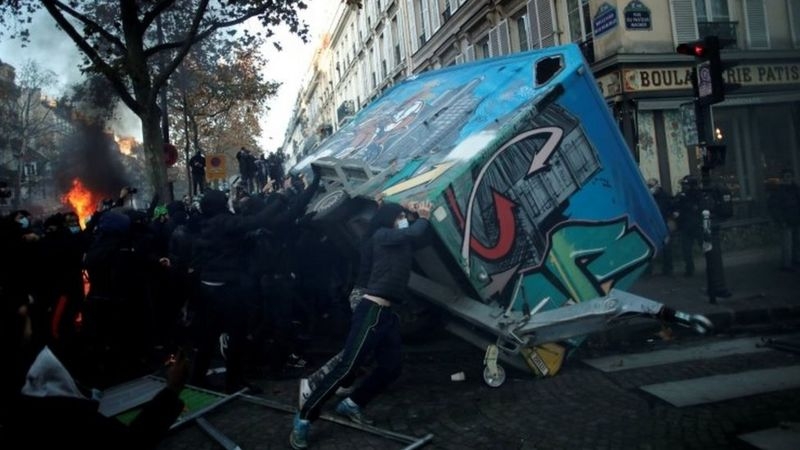 French police have fired tear gas at protesters rallying in Paris against a bill that would make it a criminal offence to film or take photos of police with malevolent intent.