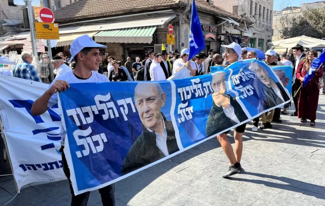 "Is Netanyahu coming back?" I ask an activist from his Likud party unfurling a large banner at the entrance to Jerusalem's bustling Mahane Yehuda Market.