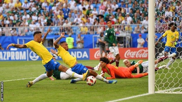Neymar scores one goal and plays a key role in the second as Brazil beat Mexico to reach a seventh consecutive World Cup quarter-final.