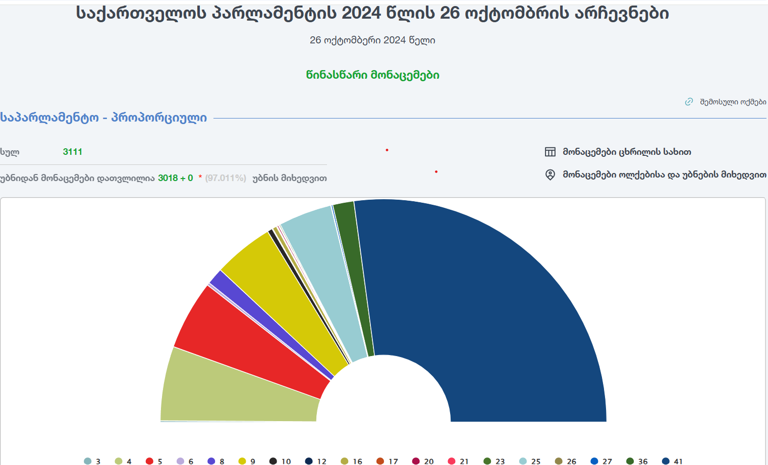 ცესკო-ს ვებგვერდზე ამ დროისათვის (27 ოქტომბერი, 07:45სთ) გამოქვეყნებული წინასწარი მონაცემებით, „ქართული ოცნება - დემოკრატიულ საქართველოს“ ხმების 54.243 პროცენტი აქვს (1 087 801 ხმა) მიღებული. ეს არის 3018 საარჩევნო უბნის მონაცემები, სულ არსებული 3111 საარჩევნო უბნიდან - სულ 97.011%.