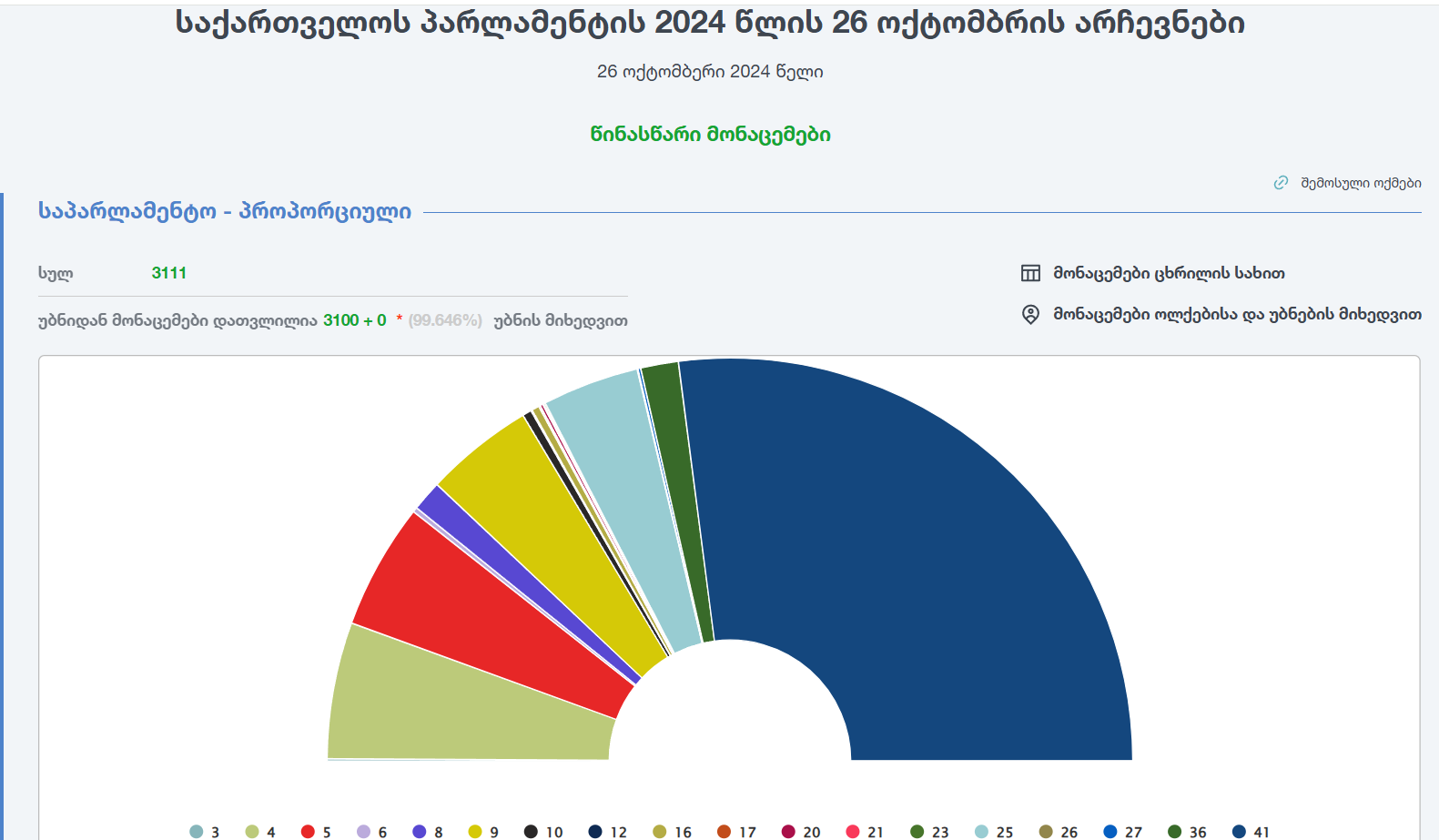 ცესკო-ს ვებგვერდზე ამ დროისათვის (27 ოქტომბერი, 11:45სთ) გამოქვეყნებული წინასწარი მონაცემებით, „ქართული ოცნება – დემოკრატიულ საქართველოს“ ხმების 54.086 პროცენტი აქვს (1 117 480 ხმა) მიღებული. ეს არის 3100 საარჩევნო უბნის მონაცემები, სულ არსებული 3111 საარჩევნო უბნიდან – 99.646%. დარჩენილია მხოლოდ 11 უბნის მონაცემების გამოქვეყნება, რაც არსებითად ვერ იმოქმედებს უკვე არსებულ შედეგზე.