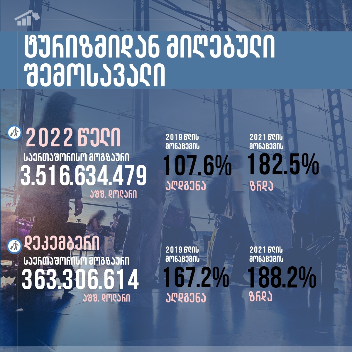 2022 წელს მოგზაურობიდან მიღებულმა შემოსავალმა გადააჭარბა 2019 წლის მაჩვენებელს და რეკორდული მაჩვენებელი დაფიქსირდა - 3,516,634,479 აშშ. დოლარი, რაც 2019 წლის ანალოგიურ მაჩვენებლის 107.6% აღდგენაა (+247,980,410 აშშ დოლარი). 2021 წელთან შედარებით მოგზაურობიდან შემოსავლები გაზრდილია +2,271,692,761 (+182.5%) აშშ დოლარით.