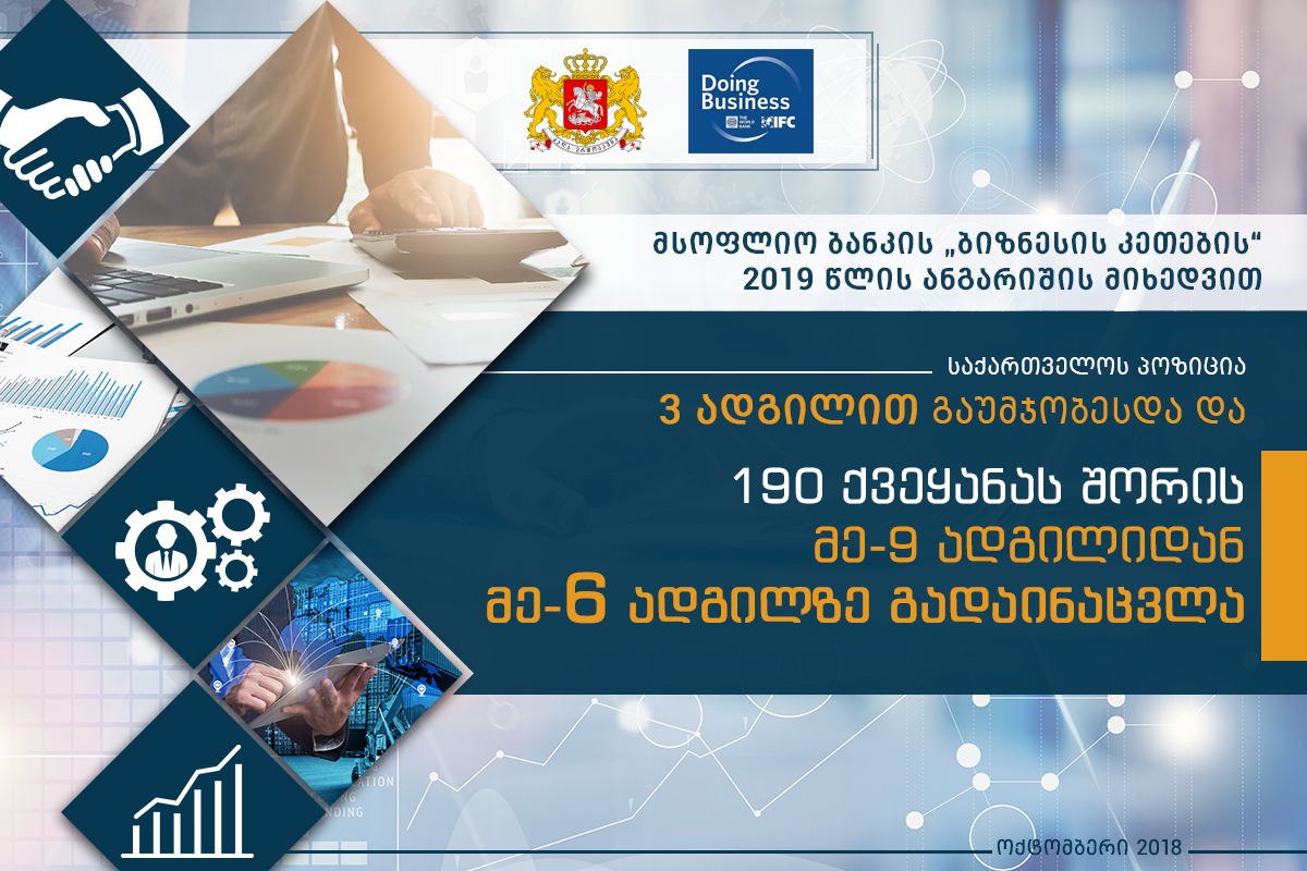 მსოფლიო ბანკის „ბიზნესის კეთების“ 2019 წლის ანგარიშის მიხედვით, საქართველომ უპრეცენდენტოდ დიდ წარმატებას მიაღწია და მსოფლიოს 190 ქვეყანას შორის მე-6 ადგილი დაიკავა.