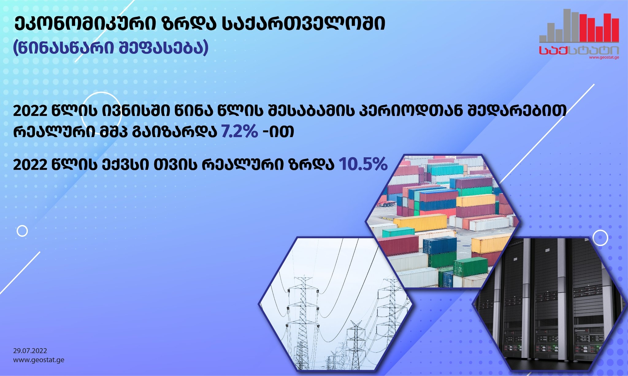 წინასწარი შეფასებით, 2022 წლის ივნისში, საქართველოში წინა წლის შესაბამის პერიოდთან შედარებით, რეალური მთლიანი შიდა პროდუქტის (მშპ) ზრდამ 7.2 პროცენტი შეადგინა, ხოლო 2022 წლის პირველი ექვსი თვის საშუალო მაჩვენებელი 10.5 პროცენტით განისაზღვრა.