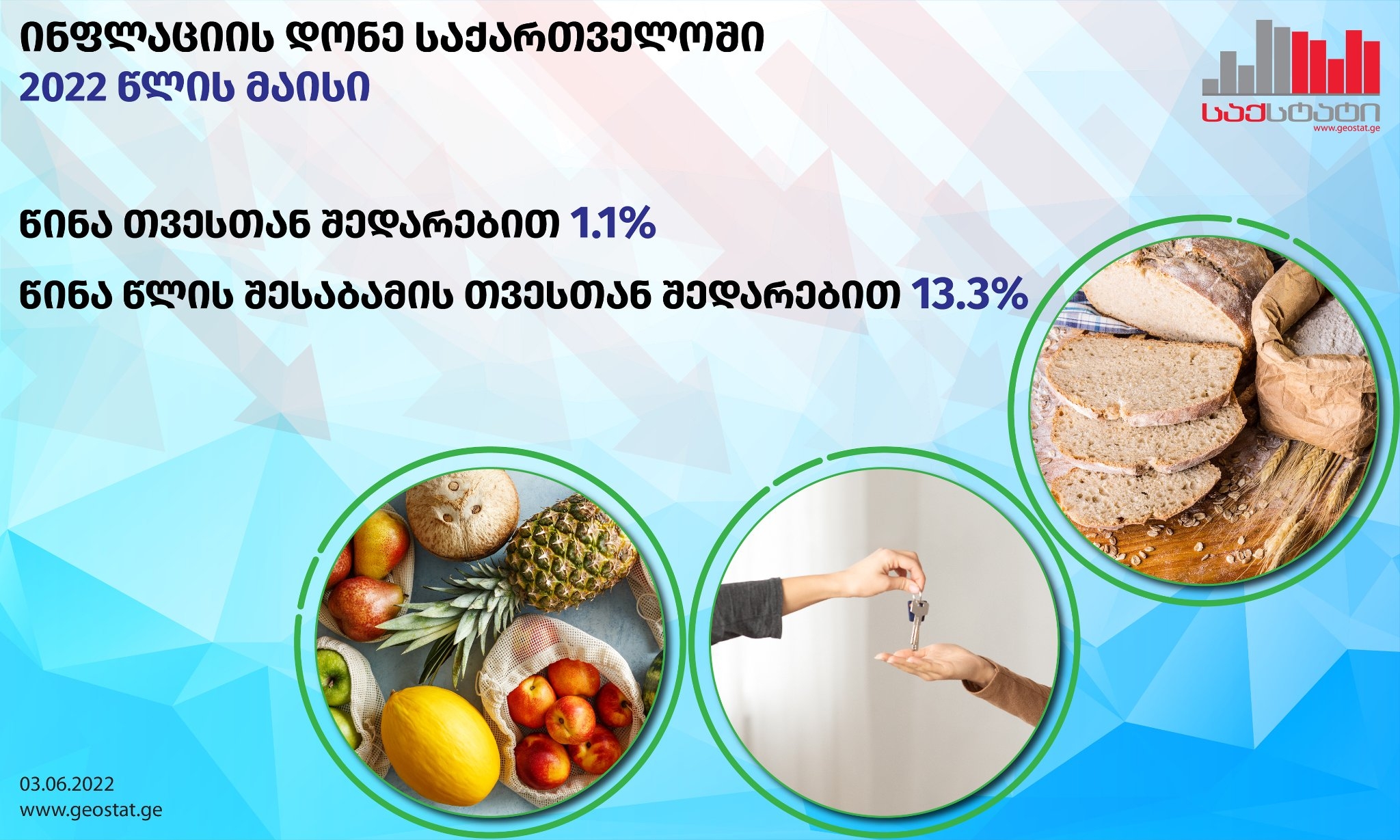 2022 წლის მაისში, წინა თვესთან შედარებით, ინფლაციის დონემ საქართველოში 1.1 პროცენტი, ხოლო წლიური ინფლაციის დონემ 13.3 პროცენტი შეადგინა. ამის შესახებ ინფორმაციას საქსტატი ავრცელებს.