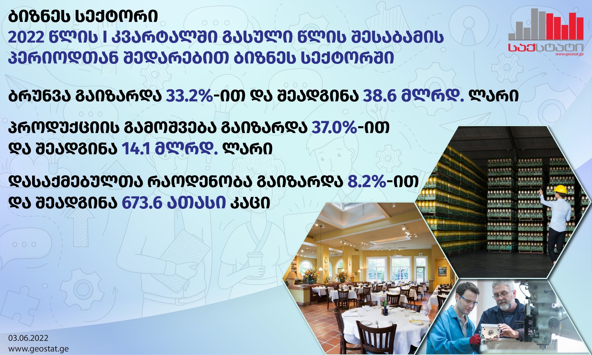 2022 წლის I კვარტალში დასაქმებულთა საშუალო რაოდენობა 673.6 ათასი კაცით განისაზღვრა, რაც გასული წლის შესაბამისი პერიოდის მაჩვენებელზე 8.2 პროცენტით მეტია. დასაქმებულთა მთლიანი რაოდენობიდან 42.8 პროცენტი ქალია, ხოლო 57.2 პროცენტი – კაცი.