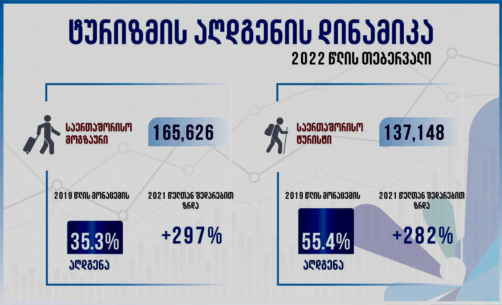 საქართველოს ეკონომიკისა და მდგრადი განვითარების სამინისტროს ტურიზმის ეროვნული ადმინიტრაციის მონაცემებით, 2022 წლის თებერვალში, საქართველოში 165,626 საერთაშორისო მოგზაურის ვიზიტი შედგა, აღდგენა 2019 წლის ანალოგიურ პერიოდთან შედარებით +35.3%-ია, 2021 წლის თებერვალთან შედარებით კი ზრდამ +297% შეადგინა.
