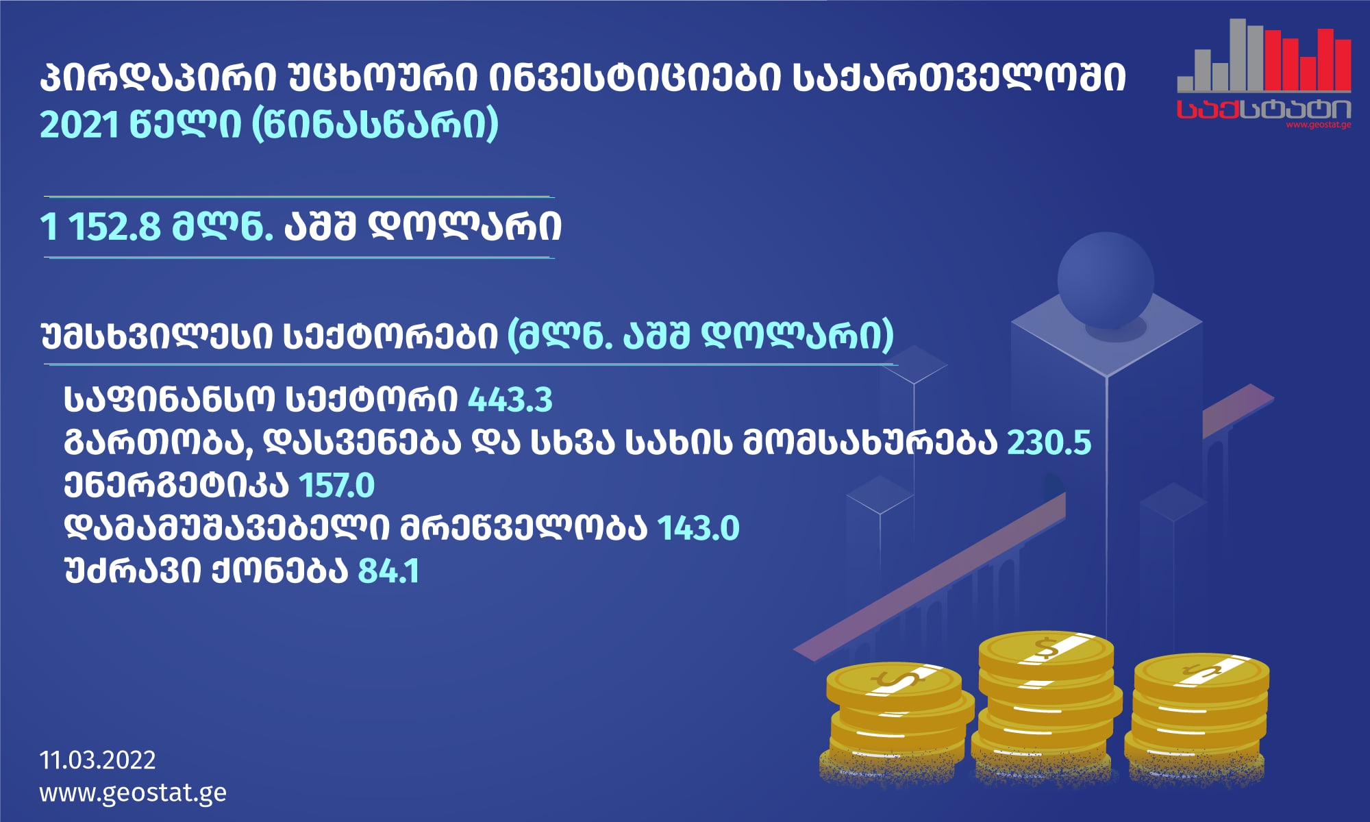 სტატისტიკის ეროვნული სამსახურის წინასწარი მონაცემებით, საქართველოში განხორციელებული პირდაპირი უცხოური ინვესტიციების მოცულობამ 2021 წელს 1 152.8 მილიონი აშშ დოლარი შეადგინა, რაც ორჯერ მეტია 2020 წლის დაზუსტებულ მონაცემებზე.