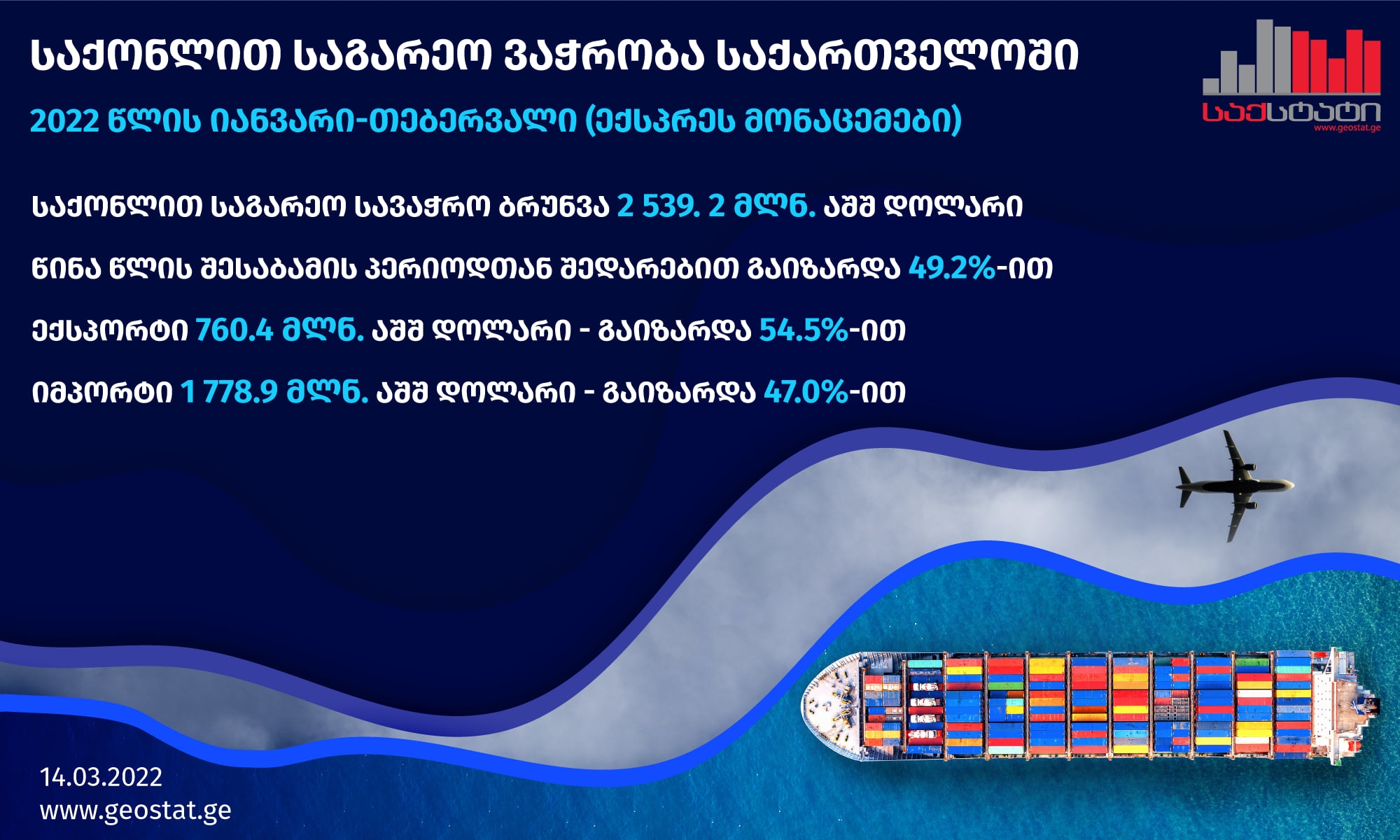 სტატისტიკის ეროვნული სამსახურის წინასწარი მონაცემებით, 2022 წლის იანვარ-თებერვალში საქართველოში საქონლით საგარეო სავაჭრო ბრუნვამ (არადეკლარირებული ვაჭრობის გარეშე) 2 539.2 მლნ. აშშ დოლარი შეადგინა, რაც წინა წლის შესაბამისი პერიოდის მაჩვენებელზე 49.2 პროცენტით მეტია. აქედან, ექსპორტი 760.4 მლნ. აშშ დოლარი იყო, ანუ 54.5 პროცენტით მეტი, ხოლო იმპორტი 1 778.9 მლნ. აშშ დოლარი – ზრდა 47.0 პროცენტია.