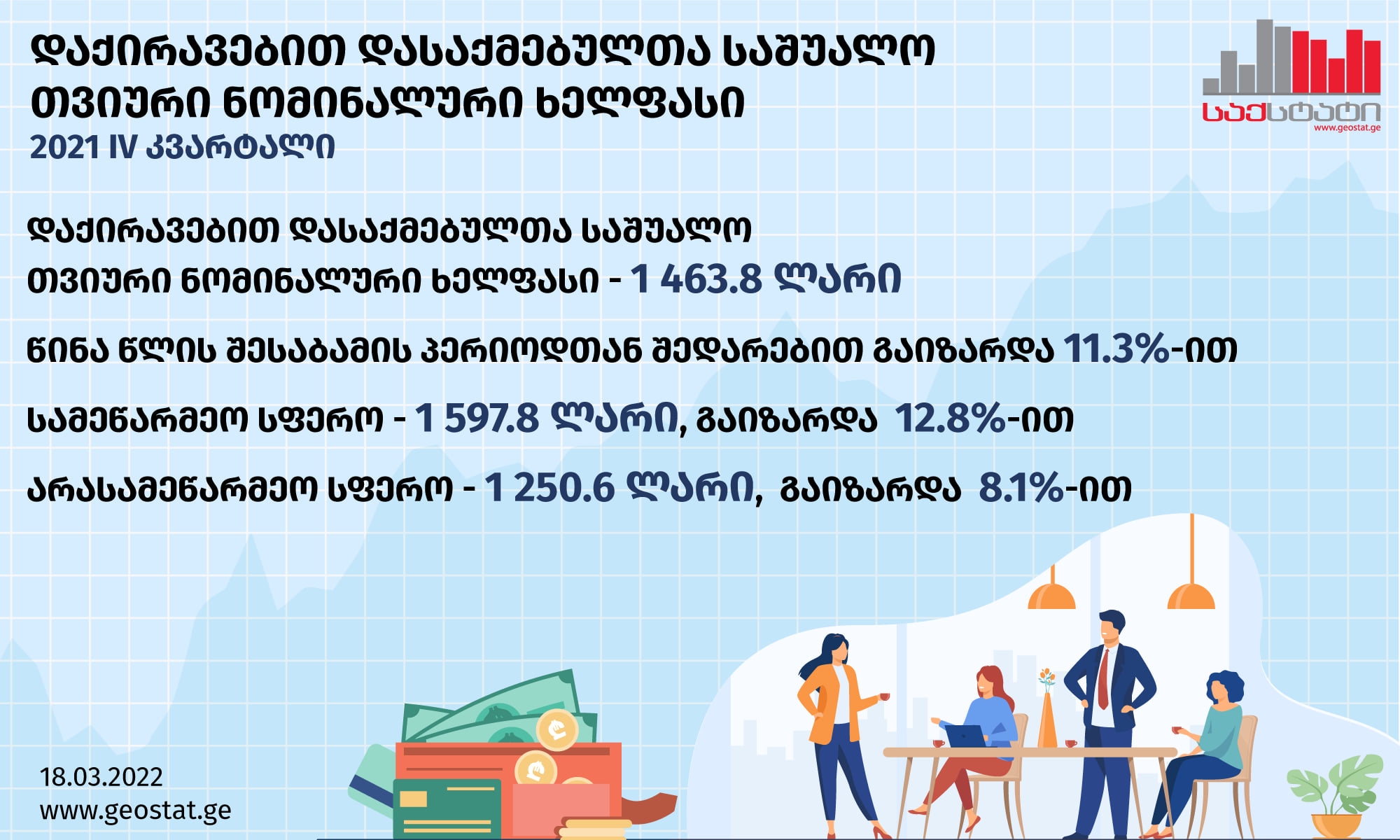 სტატისტიკის ეროვნული სამსახურის ინფორმაციით, 2021 წლის მეოთხე კვარტალში საქართველოში საშუალო თვიური ნომინალური ხელფასი გასული წლის შესაბამის პერიოდთან შედარებით 11.3 პროცენტით, ანუ 149.1 ლარით გაიზარდა და 1 463.8 ლარი შეადგინა.