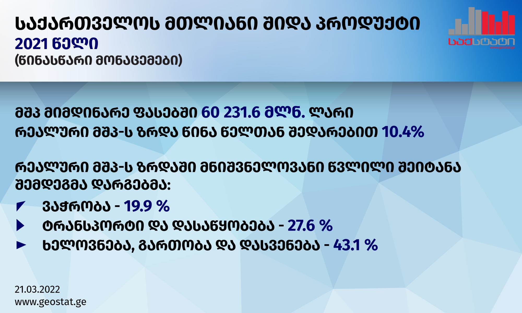 სტატისტიკის ეროვნული სამსახურის 2021 წლის წინასწარი მონაცემებით მთლიანი შიდა პროდუქტის მოცულობა მიმდინარე ფასებში 60 231.6 მლნ. ლარს გაუტოლდა, რაც 22.3 პროცენტით აღემატება წინა წლის შესაბამის მაჩვენებელს, ხოლო რეალური მთლიანი შიდა პროდუქტის ზრდამ 2021 წელს, წინა წელთან შედარებით 10.4 პროცენტი შეადგინა.