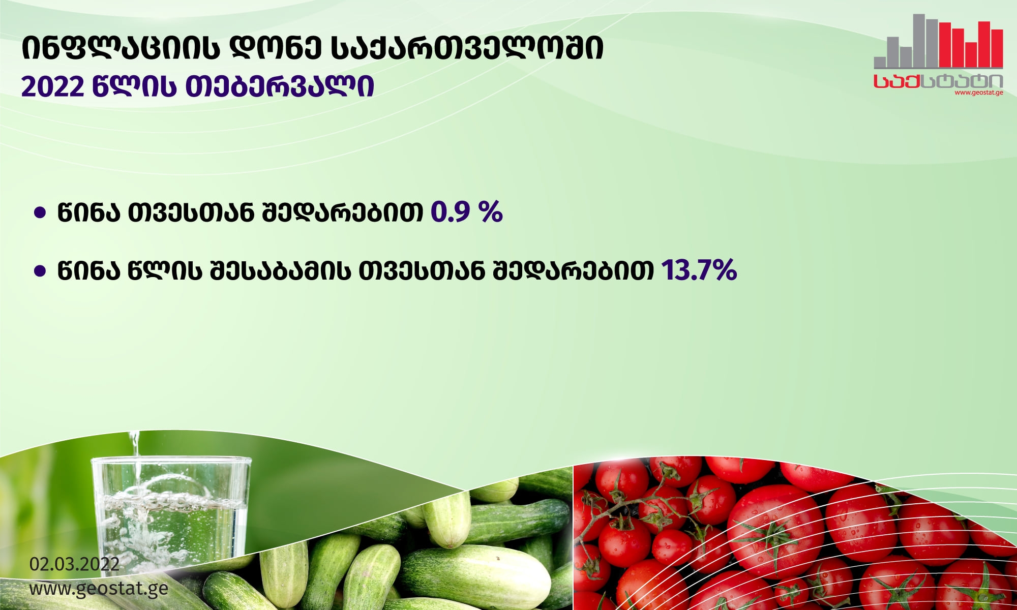 სტატისტიკის ეროვნული სამსახურის ინფორმაციით, 2022 წლის თებერვალში, წინა თვესთან შედარებით ინფლაციის დონემ საქართველოში 0.9 პროცენტი, ხოლო წლიური ინფლაციის დონემ 13.7 პროცენტი შეადგინა.
