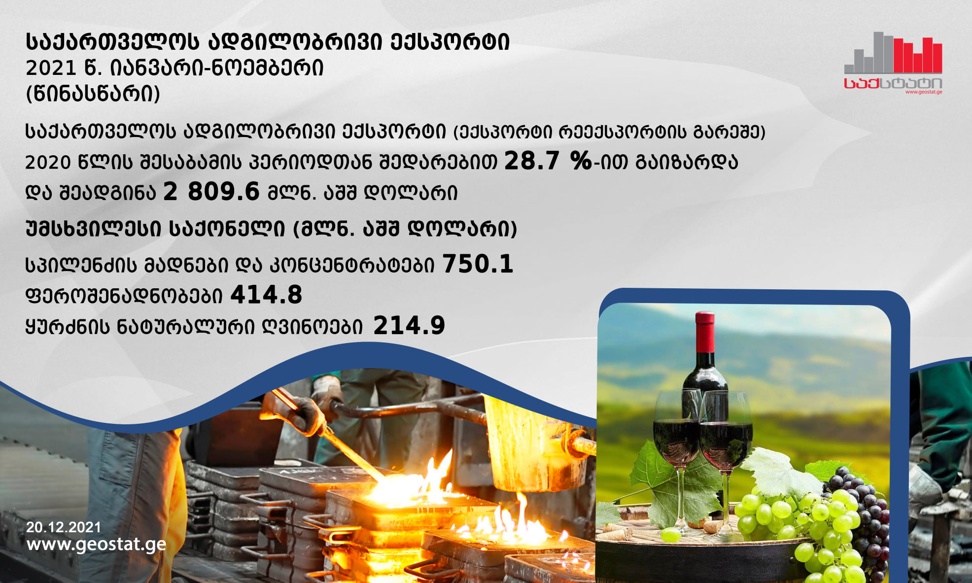 სტატისტიკის ეროვნული სამსახურის წინასწარი მონაცემებით, 2021 წლის იანვარ-ნოემბერში საქართველოდან განხორციელებული საქონლის ექსპორტის მოცულობამ (არადეკლარირებული ექსპორტის გარეშე) 3 822.9 მლნ. აშშ დოლარი შეადგინა, რაც 26.7 პროცენტით მეტია გასული წლის შესაბამისი პერიოდის მაჩვენებელზე.