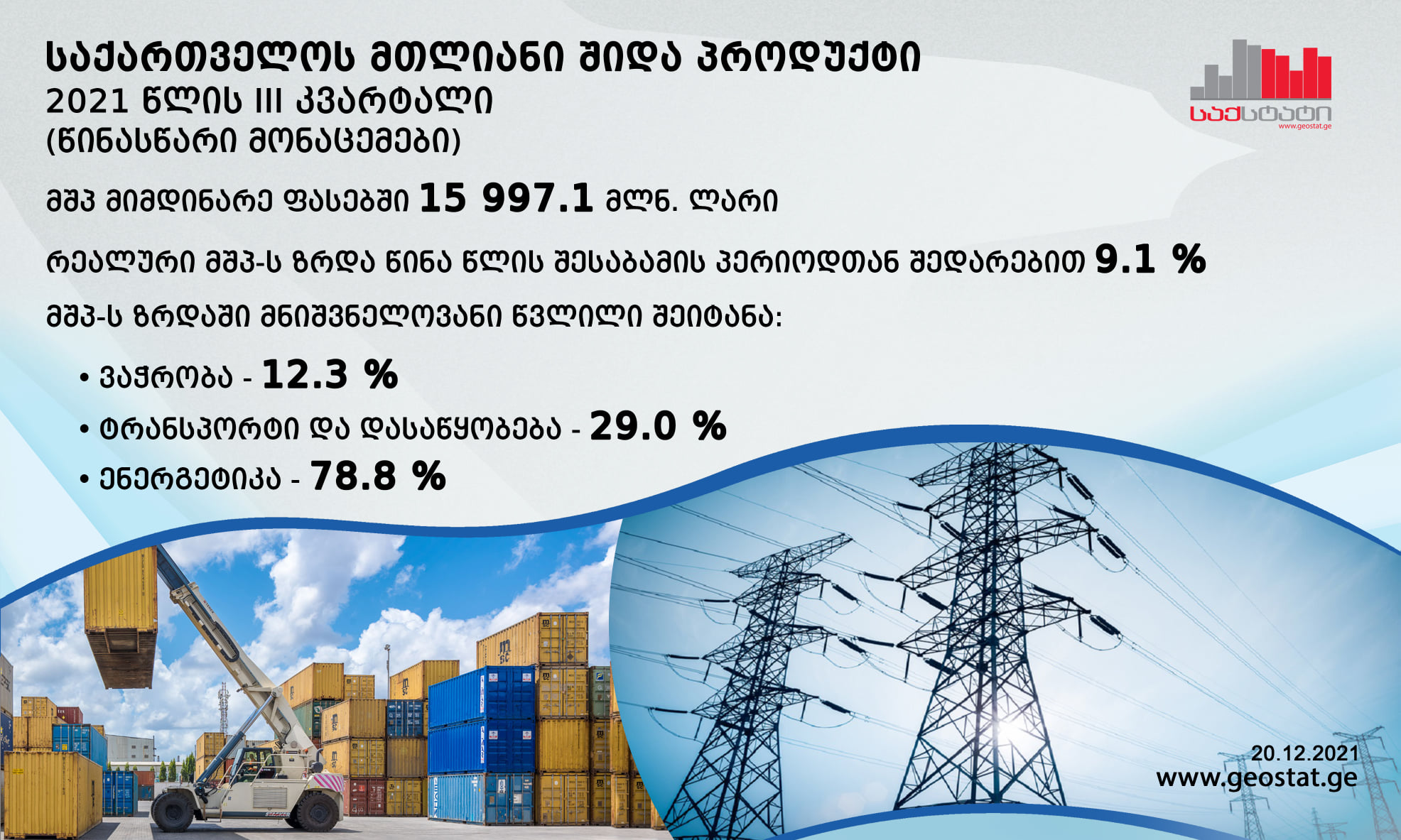 სტატისტიკის ეროვნული სამსახურის ინფორმაციით, 2021 წლის მესამე კვარტალში მთლიანი შიდა პროდუქტის მოცულობა მიმდინარე ფასებში 15 997.1 მლნ. ლარს გაუტოლდა, ხოლო წინა წლის შესაბამის პერიოდთან შედარებით რეალური მთლიანი შიდა პროდუქტის ზრდამ 9.1 პროცენტი შეადგინა. მთლიანი შიდა პროდუქტის დეფლატორი გაიზარდა 9.4 პროცენტით.