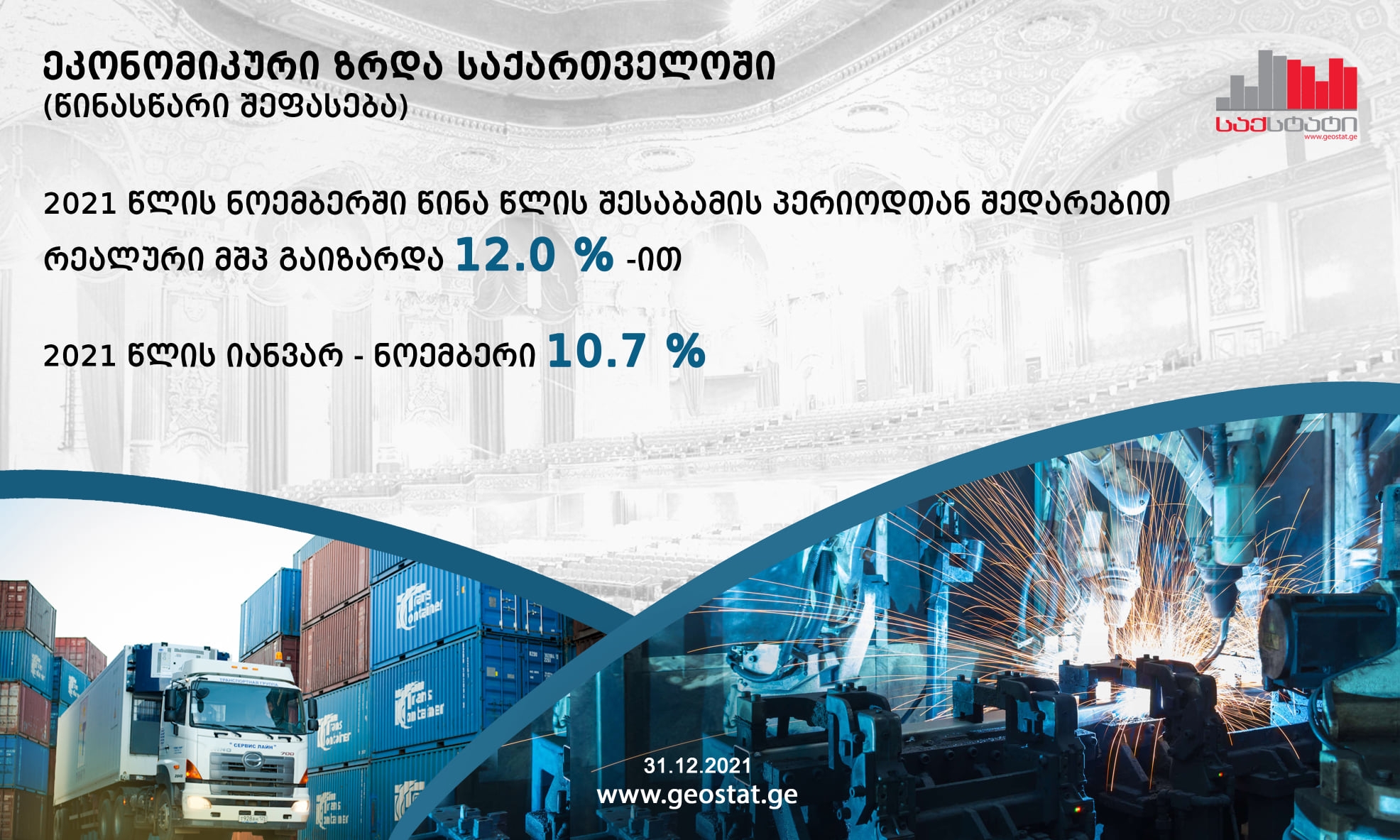 სტატისტიკის ეროვნული სამსახურის წინასწარი მონაცემების მიხედვით, 2021 წლის ნოემბერში, წინა წლის შესაბამის პერიოდთან შედარებით, საქართველოში რეალური მთლიანი შიდა პროდუქტის (მშპ) ზრდამ 12.0 პროცენტი შეადგინა.