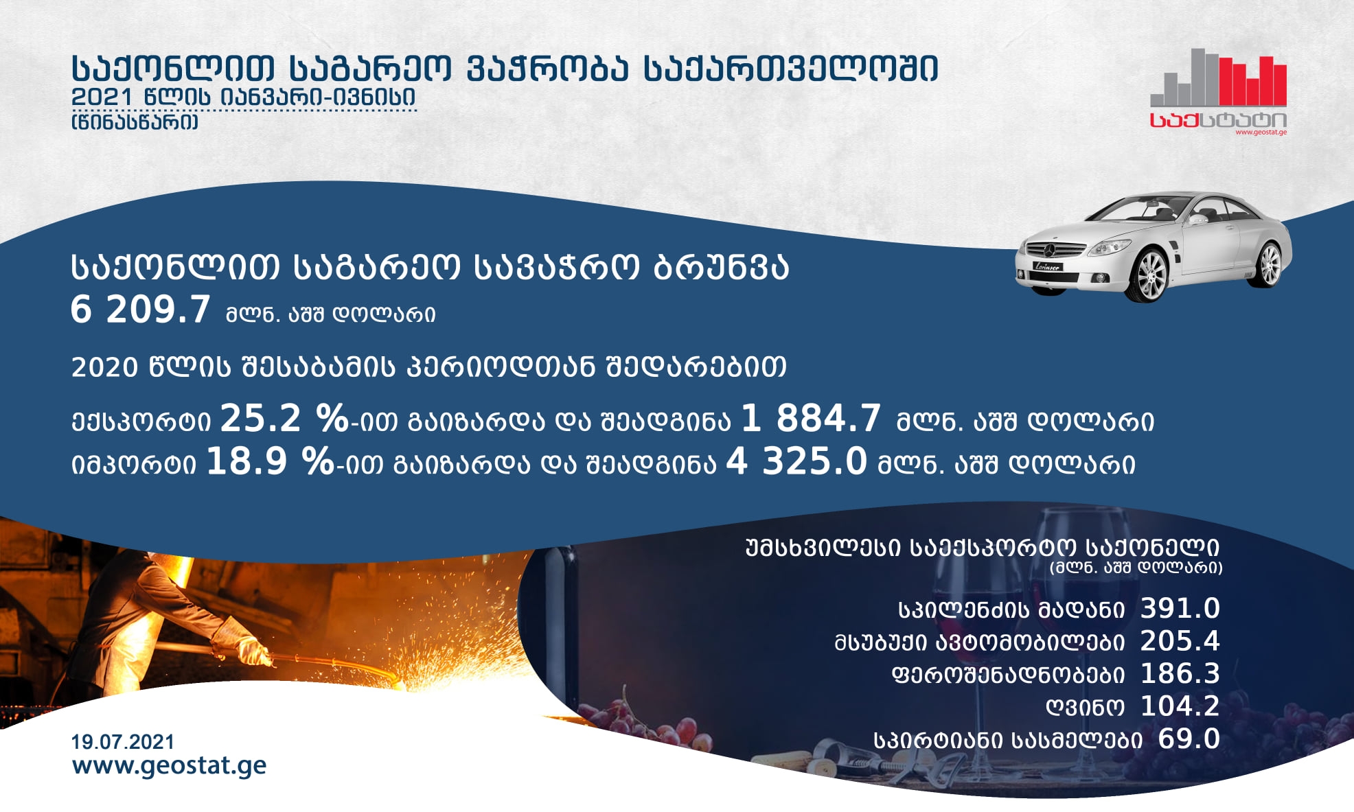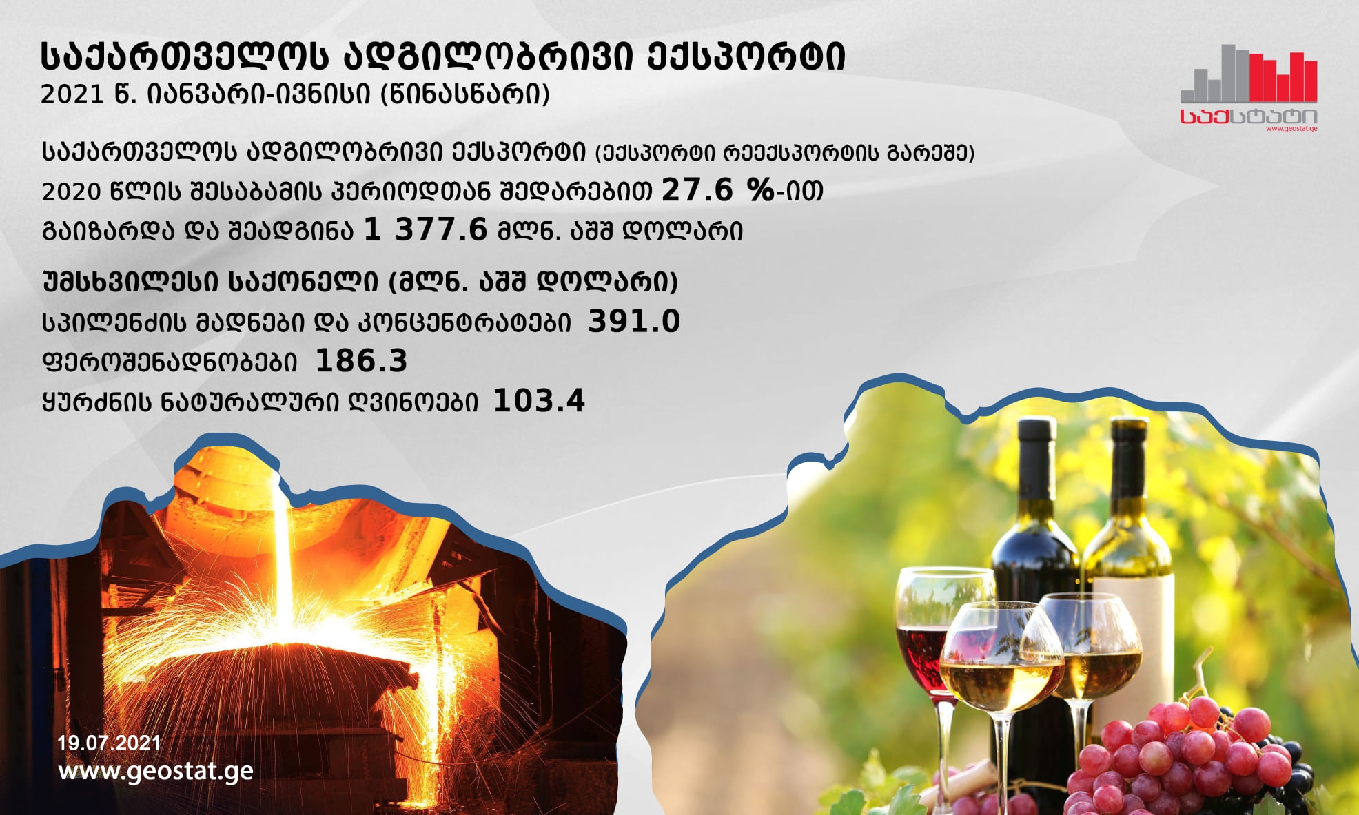 სტატისტიკის ეროვნული სამსახურის წინასწარი მონაცემებით, 2021 წლის იანვარ-ივნისში საქართველოდან განხორციელებული საქონლის ექსპორტის მოცულობამ (არადეკლარირებული ექსპორტის გარეშე) 1 884.7 მლნ. აშშ დოლარი შეადგინა, რაც 25.2 პროცენტით მეტია გასული წლის შესაბამისი პერიოდის მაჩვენებელზე.