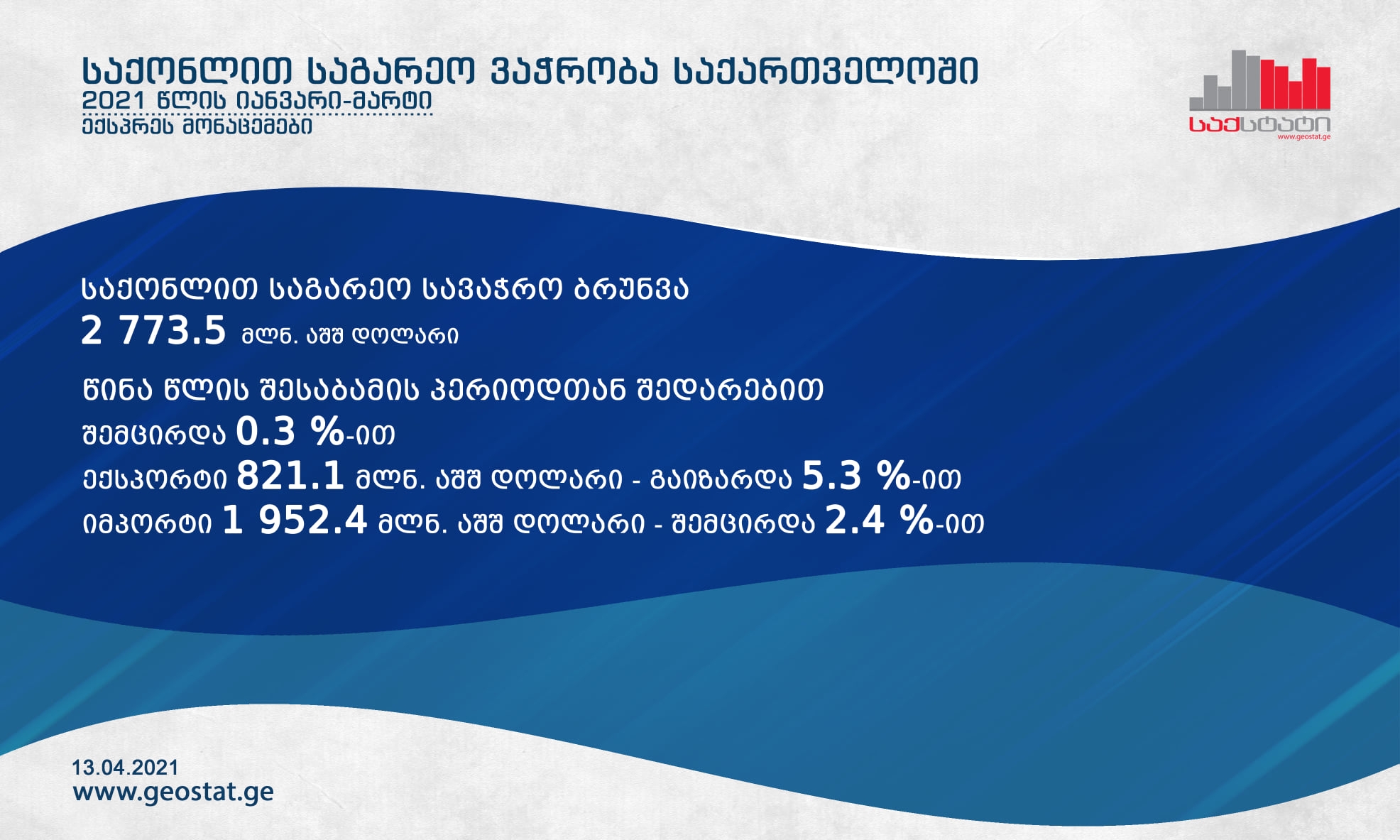 სტატისტიკის ეროვნული სამსახურის წინასწარი მონაცემებით, 2021 წლის იანვარ-მარტში საქართველოში საქონლით საგარეო სავაჭრო ბრუნვამ (არადეკლარირებული ვაჭრობის გარეშე) 2 773.5 მლნ. აშშ დოლარი შეადგინა, რაც წინა წლის შესაბამისი პერიოდის მაჩვენებელზე 0.3 პროცენტით ნაკლებია.