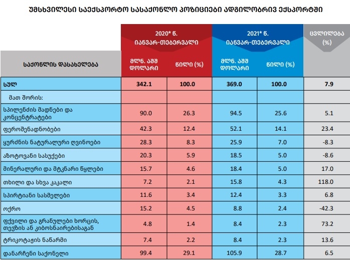სტატისტიკის ეროვნული სამსახურის წინასწარი შედეგების მიხედვით, 2021 წლის იანვარ-თებერვალში საქართველოდან განხორციელებული საქონლის ექსპორტის მოცულობამ (არადეკლარირებული ექსპორტის გარეშე) 494.7 მლნ. აშშ დოლარი შეადგინა, რაც 6.8 პროცენტით ნაკლებია გასული წლის შესაბამისი პერიოდის მაჩვენებელზე.