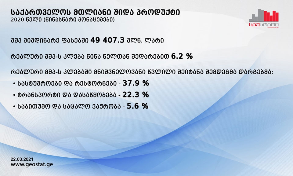 სტატისტიკის ეროვნული სამსახურის 2020 წლის წინასწარი მონაცემებით, მთლიანი შიდა პროდუქტის მოცულობა მიმდინარე ფასებში 49 407.3 მლნ. ლარს გაუტოლდა, რაც 0.3 პროცენტით აღემატება წინა წლის შესაბამის მაჩვენებელს, ხოლო რეალური მთლიანი შიდა პროდუქტის კლებამ 2020 წელს წინა წელთან შედარებით 6.2 პროცენტი შეადგინა. მთლიანი შიდა პროდუქტის დეფლატორის პროცენტული ცვლილება 2020 წელს 6.9 პროცენტით განისაზღვრა.