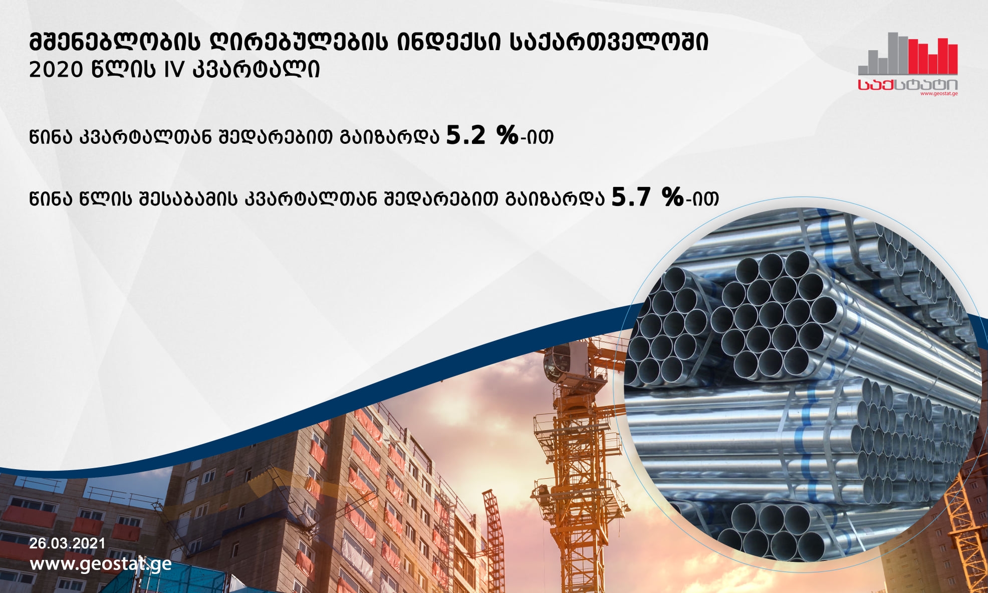 სტატისტიკის ეროვნული სამსახურის ინფორმაციით 2020 წლის მეოთხე კვარტალში, მშენებლობის ღირებულების ინდექსი წინა კვარტალთან შედარებით 5.2 პროცენტით გაიზარდა.