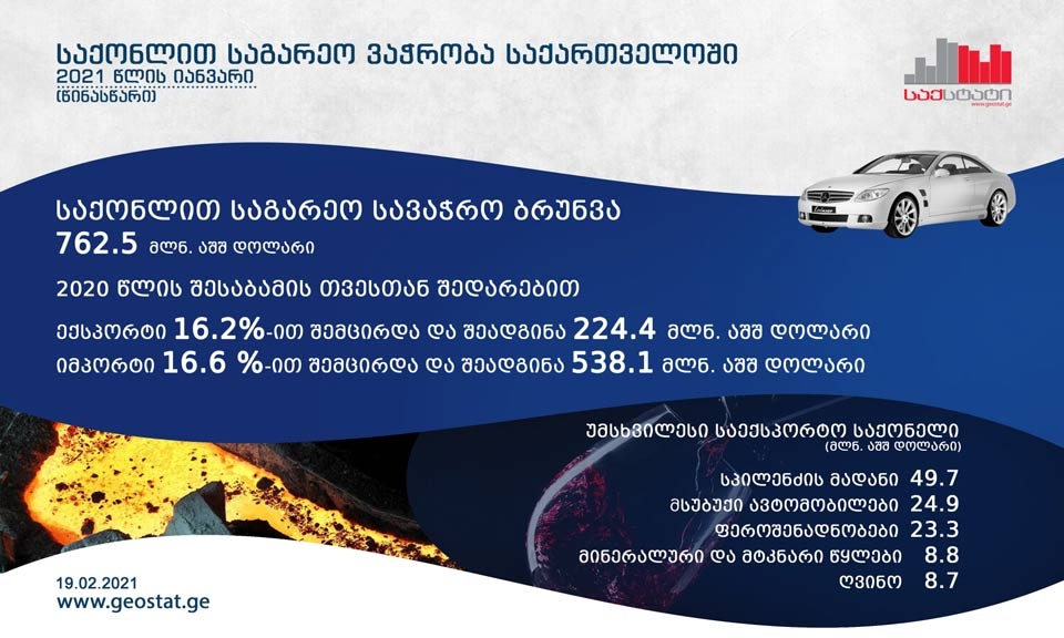 სტატისტიკის ეროვნული სამსახურის მონაცემებით, 2021 წლის იანვარში საქართველოში საქონლით საგარეო სავაჭრო 762.5 მლნ. აშშ დოლარი შეადგინა, რაც წინა წლის შესაბამის თვესთან შედარებით 16.5 პროცენტით ნაკლებია. აქედან ექსპორტი 224.4 მლნ. აშშ დოლარს შეადგენს (16.2 პროცენტით ნაკლებია), ხოლო იმპორტი 538.1 მლნ. აშშ დოლარს (16.6 პროცენტით ნაკლებია).