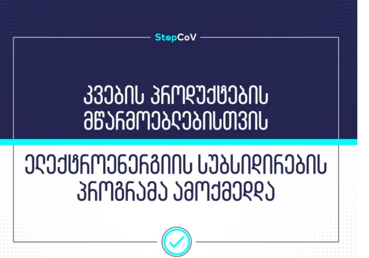 გარკვეული კატეგორიის კვების პროდუქტების მწარმოებელ მეწარმეებს სახელმწიფო დაუსუბსიდირებს ელექტროენერგიის 2021 წელს მოქმედ სამომხმარებლო ტარიფსა და 2020 წელს მოქმედ ტარიფს შორის წარმოქმნილი სხვაობის 50 პროცენტს.