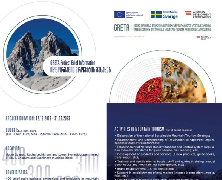 პროექტ GRETA-ს ფარგლებში (მწვანე ეკონომიკა: მდგრადი სამთო ტურიზმი და ორგანული სოფლის მეურნეობა), ევროკავშირმა, შვედეთმა და ავსტრიამ, სამთო ტურიზმის სექტორში, მესტიის, ლენტეხის, ცაგერის, ონის, ამბროლაურის, საჩხერეს, ჭიათურას და ტყიბულის მუნიციპალიტეტებში, საბაზრო მოთხოვნებზე მორგებული ბიზნეს გარემოს შექმნის მიზნით, ადგილობრივი განვითარების ინიციატივების საგრანტო კონკურსი გამოაცხადა.