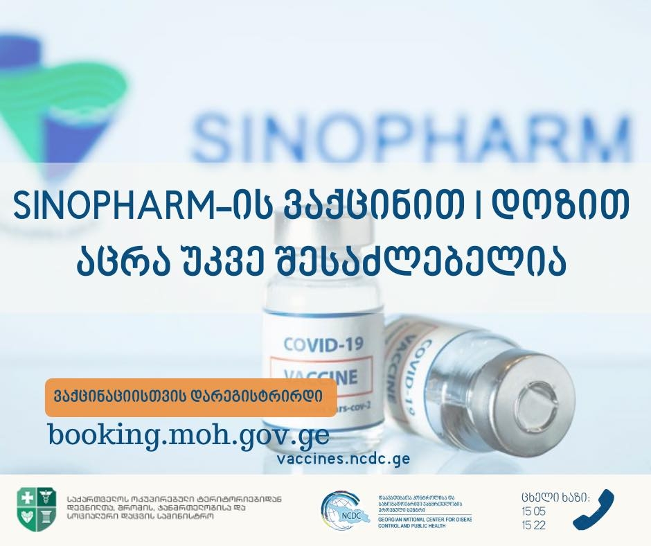 საქართველოს დევნილთა, შრომის, ჯანმრთელობისა და სოციალური დაცვის სამინისტროს ცნობით, სინოფარმის ვაქცინით აცრისთვის პირველ დოზაზე რეგისტრაცია უკვე შესაძლებელია.