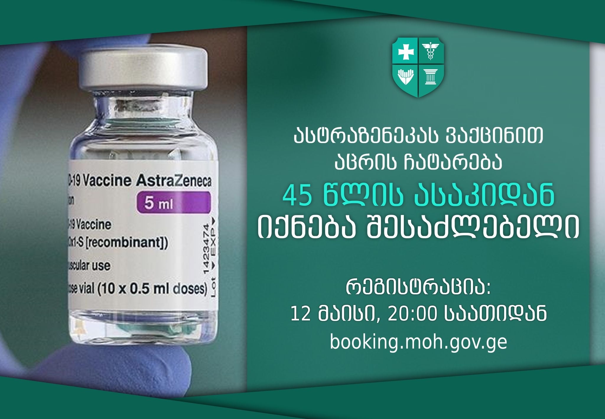 საქართველოში „ასტრაზენეკას“ ვაქცინით აცრის ასაკობრივმა ჯგუფმა 45 წლის ასაკამდე დაიწია. დევნილთა, შრომის, ჯანმრთელობისა და სოციალური დაცვის სამინისტროს განცხადებით, 45 წელს ზემოთ მოქალაქეები ვაქცინაციისთვის რეგისტრაციის გავლას 12 მაისის 20:00 საათიდან შეძლებენ.
