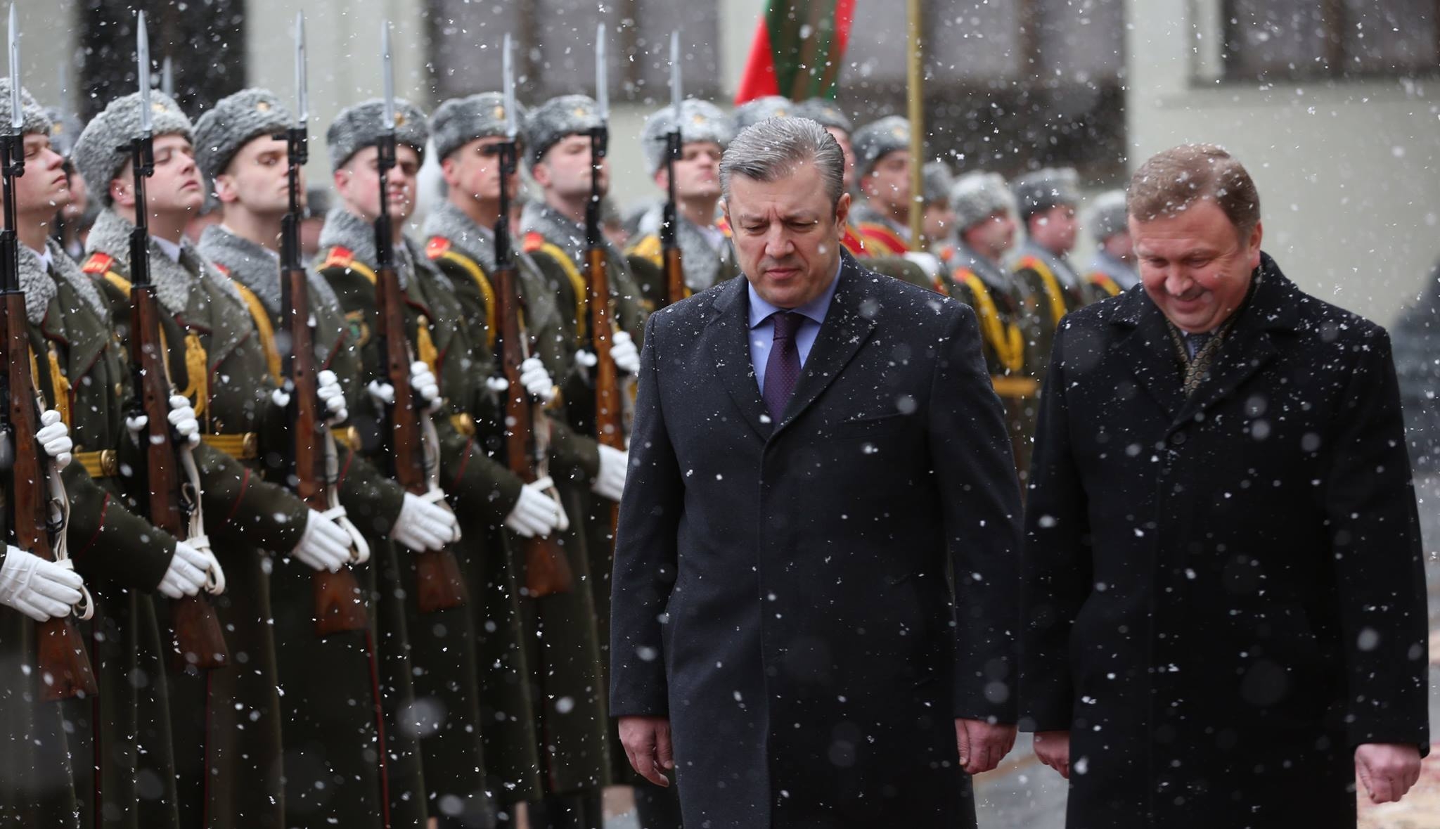 საქართველოს პრემიერ-მინისტრის პატივსაცემად, ბელარუსის რესპუბლიკის მთავრობის სასახლეში დახვედრის ოფიციალური ცერემონია გაიმართა. გიორგი კვირიკაშვილს ბელარუსმა კოლეგამ, ანდრეი კობიაკოვმა უმასპინძლა. შესრულდა ორი ქვეყნის სახელმწიფო ჰიმნები.