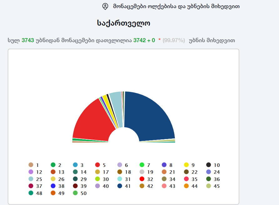 ცენტრალურ საარჩევნო კომისიას საქართველოს 3 743 საარჩევნო უბნიდან ამ დროისთვის (17:00 სთ) 3 742 უბნის მონაცემები აქვს გამოქვეყნებული და მხოლოდ 2 უბნის შედეგებია უცნობი, ასე რომ, არსებითად არაფერი შეიცვლება.