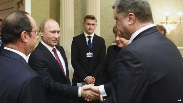 ბელორუსის დედაქალაქ მინსკში რუსეთისა და უკრაინის პრეზიდენტები, ვლადიმერ პუტინი და პეტრო პოროშენკო, გერმანიის კანცლერის, ანგელა მერკელისა და საფრანგეთის პრეზიდენტის, ფრანსუა ოლანდის თაოსნობით, მთელი ღამის განმავლობაში განაგრძობდნენ მოლაპარაკებებს ცეცხლის შეწყვეტის თაობაზე.