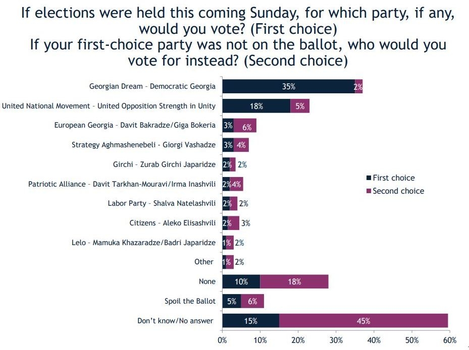 საერთაშორისო რესპუბლიკური ინსტიტუტის (IRI) კვლევების მიხედვით, კითხვაზე, კვირას რომ არჩევნები იყოს, რომელ პარტიას მისცემდით ხმას, გამოკითხულთა 35 პროცენტი პასუხობს, რომ ხმას მისცემდა „ქართულ ოცნებას“, „ნაციონალურ მოძრაობას“ ასახელებს გამოკითხულთა 18 პროცენტი, „ევროპული საქართველოს“ კი სამი პროცენტი.