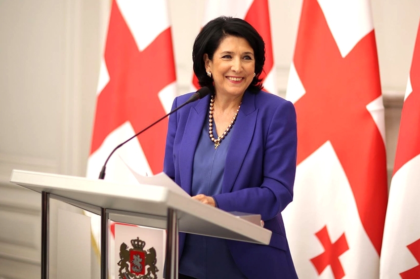 საქართველოს პრეზიდენტი სალომე ზურაბიშვილი ბიძინა ივანიშვილს საპატიო ლეგიონის კავალერის ტიტულის მინიჭებას ულოცავს.